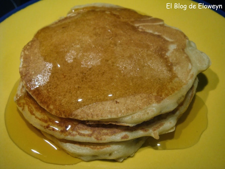 Justamente el otro día me estaba acordando de aquellos pancakes, y pensé en hacerlos yo misma. Busqué por internet una receta, y me puse a ello. La receta que encontré fue de La Cocina de Lechuza, y he de decir que salieron incluso mejor que las que probé en China. Los pancakes se suelen tomar con sirope de arce, pero aquí en España, según me dijeron, es muy difícil de encontrar... y si lo encuentras, lo pagas a precio de oro. O sea, que le puse miel en unos y sirope de fresa en otros. También se puede poner mermelada, o chocolate, o lo que os venga bien.