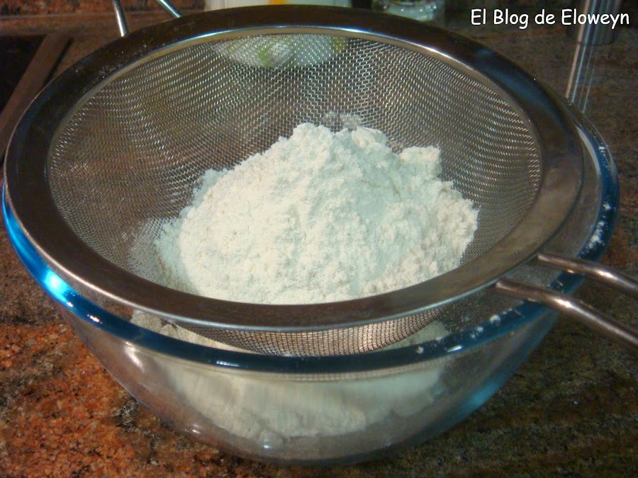 Mezclar la harina, la levadura, la sal y el azúcar vainillado. Es conveniente tamizarlo para que se mezclen bien y no hayan grumos. Como no dispongo de un tamizador, usé un colador, que a efectos prácticos hace la misma función.