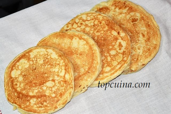Por último, hacemos los pancakes. En una sartén (de 10 cms) a fuego medio, engrasada con mantequilla, esparcimos un cucharón de masa en el fondo de la misma aproximadamente de 1/2 cm a 1 cm de grosor. Los cocemos por las dos caras aproximadamente 1 minuto por cada cara. Nos tienen que quedar un poco dorados pero jugosos. Los reservamos uno encima de otro para que mantengan bien el calor.