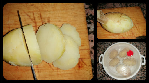 Una vez pasado el tiempo, sacamos (cuidado al quitar la tapa de no quemarse con el vapor acumulado), las sacamos y dejamos enfriar, para luego pelar y cortar en rodajas más o menos finas, según gustos