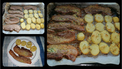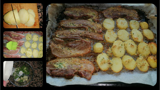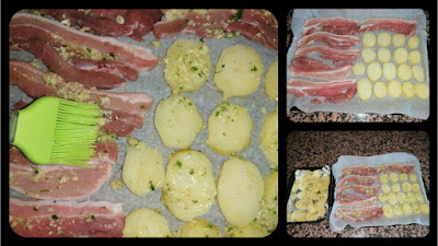 Colocamos la panceta y las patatas en una bandeja o molde con papel de horno, y pincelamos bien toda la carne y las patatas con la mezcla