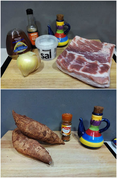 Se trata al fin y al cabo de una carne económica a la que le vamos a dar un poco de chispa asándola con una mezcla de miel y salsa de soja. Os la recomiendo, de verdad, porque a pesar de ser una de las partes más grasas del cerdo, esa salsita que queda con el jugo que ha ido soltando la carne es una autentica maravilla. Además la vamos a acompañar de unos boniatos al horno con un toque de cayena que veréis que bien le va. No me enrollo más y os dejo con la receta. Para 4-6 personas vamos a necesitar: