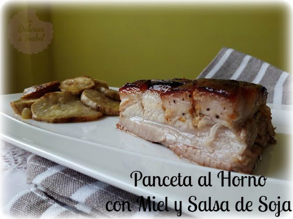 AOVEPonemos aceite en una fuente para horno y disponemos por encima la cebolla cortada en juliana. Sazonamos y reservamos. A la panceta le hacemos unos cortes por la parte de la corteza, salpimentamos por ambos lados y la colocamos en la fuente que teníamos con las cebollas con la piel hacia abajo. Mezclamos la miel con la salsa de soja y vertemos por encima. Lo metemos al horno precalentado a 180º durante 20-30 minutos. Pasado el tiempo, damos la vuelta a la carne y seguimos cocinando durante 1 hora y media aproximadamente, vigilando que no se queme la piel y bañándola con el jugo que irá soltando cada 20 minutos.