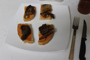 Una vez cocinada la panceta, la troceamos y la repartimos entre las rebanadas troceadas.