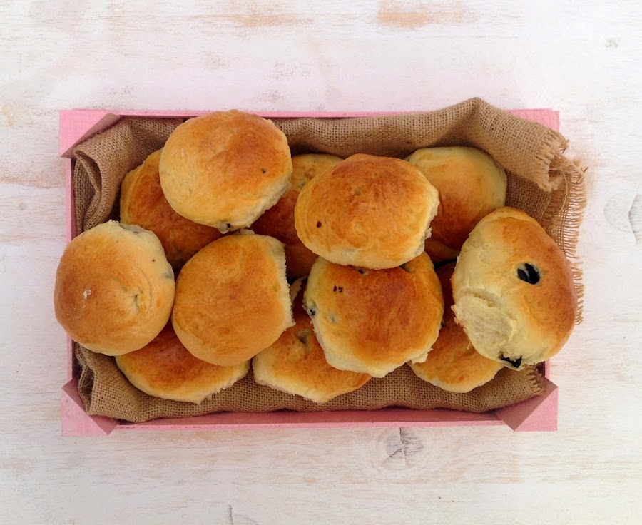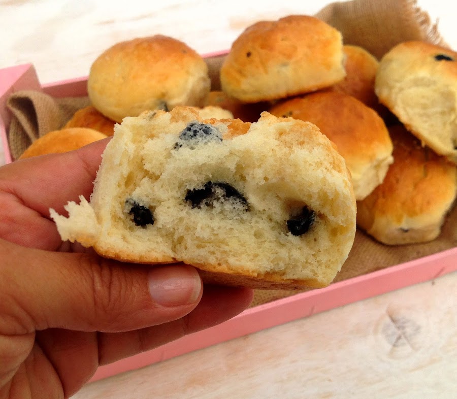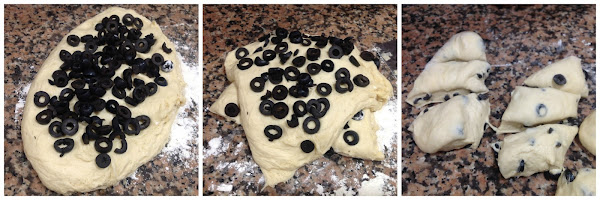 Una vez que ha pasado el tiempo la masa habrá duplicado su volúmen, la retiramos del bol poniéndola sobre la encimera enharinada. Aplastamos con los dedos para quitar el exceso de gases que se forman con el leudado. Ponemos la aceitunas troceadas, sin hueso, por encina y aplastamos contra la masa. Cortamos la masa en dos y superponemos como en la imágen, volvemos a cortar en dos y volvemos a superponer las masas, de esta manera incorporamos bien las aceitunas. Cortamos en trozos pequeños y formamos los pancitos. Salen 11 piezas de 90 gr aproximadamente.