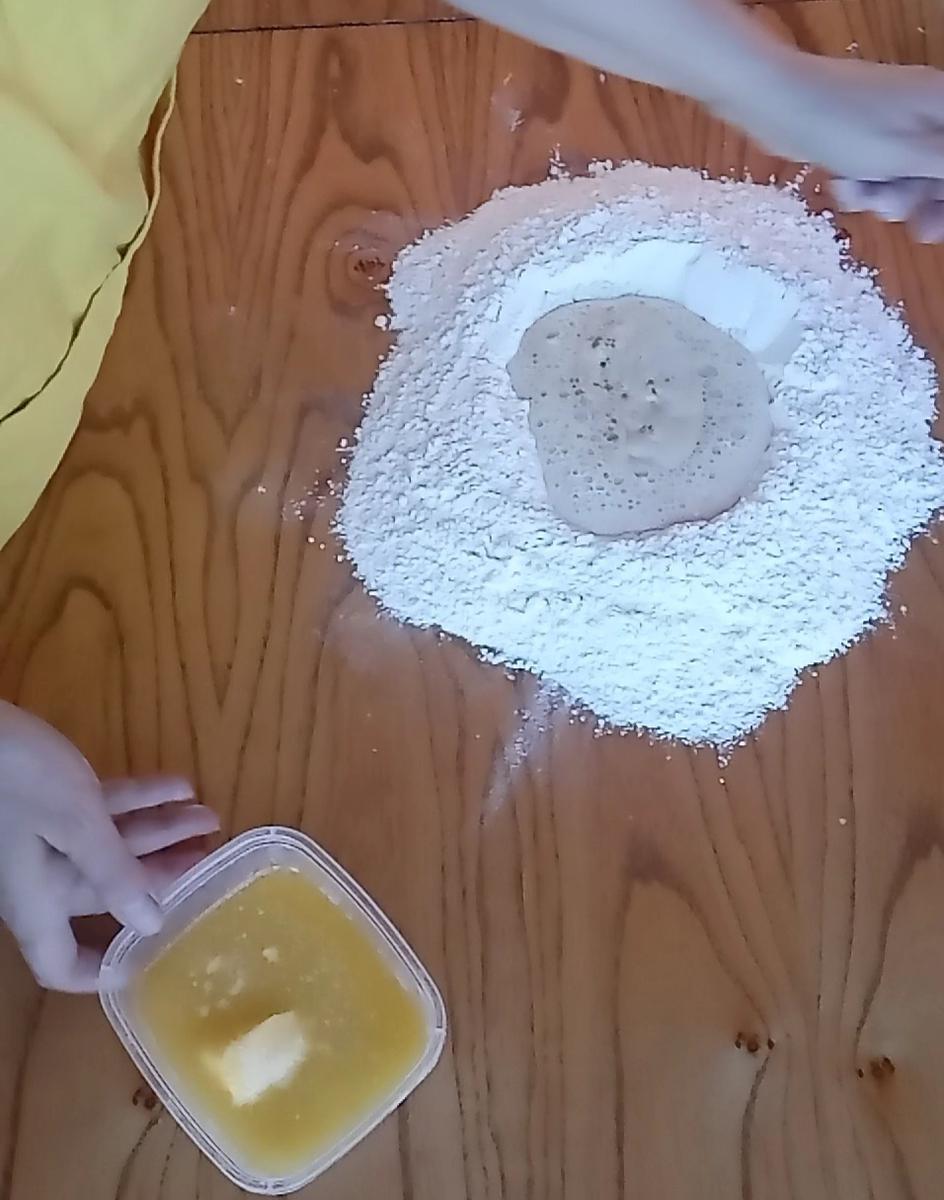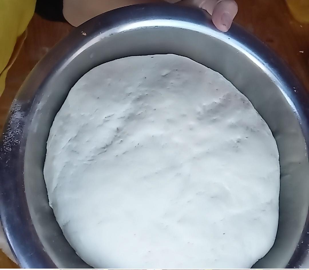 Formar una corona con la harina, y distribuir alrededor y lejos del centro la sal, y hacer un hueco en el medio.En un bol aparte disolver la levadura con una poco del agua que tenemos tibia y agregar una cucharadita de azúcar, dejar que espume.