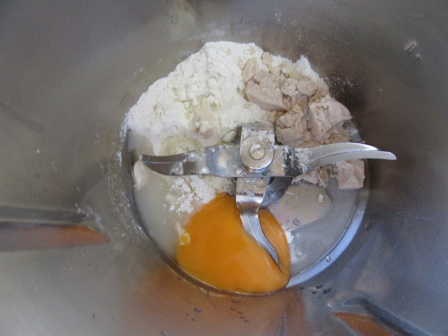 Levado 1- En un bol, echar 40 gr. harina, 5 gr, azúcar, la levadura desmigada, 1 yema y una cda. sopera agua o agua de azahar, y mezclar todo muy bien, hacer una bola y meter en la cubeta engrasada: