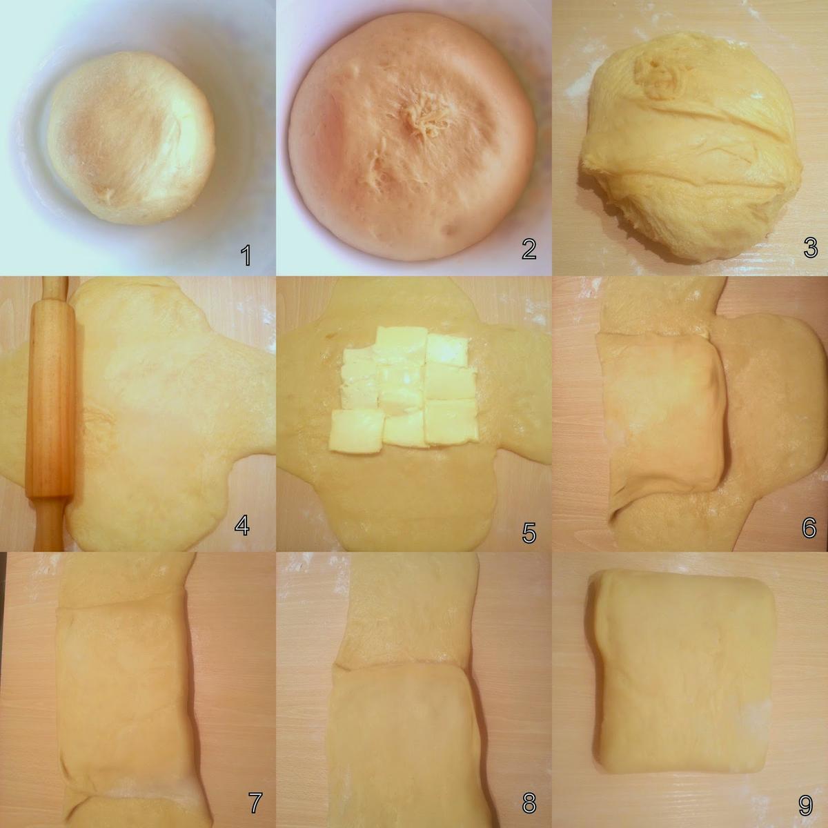 Ahora repetimos la misma operación anterior estirar, doblar (folleto), frigorifico por 15 minutos, sacamos, giramos y tendremos LA TERCERA VUELTA, imagen B, fotos del 1 al 5), volvemos a llevar al frigorifico y al sacarla despues del reposo, estiramos la masa muy bien y dependiendo del molde que tengas, como esta receta es para un molde de un kilo, si tienes un molde de un kilo esta lista para llevar al molde a su ultima fermentación.