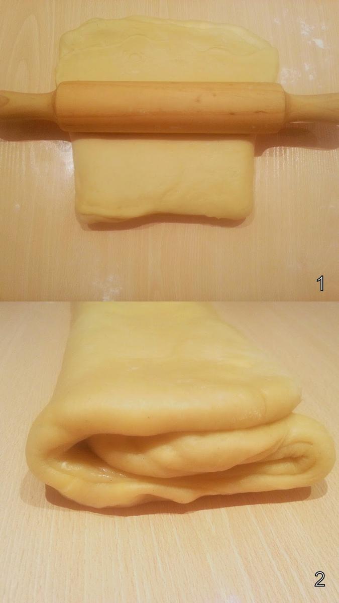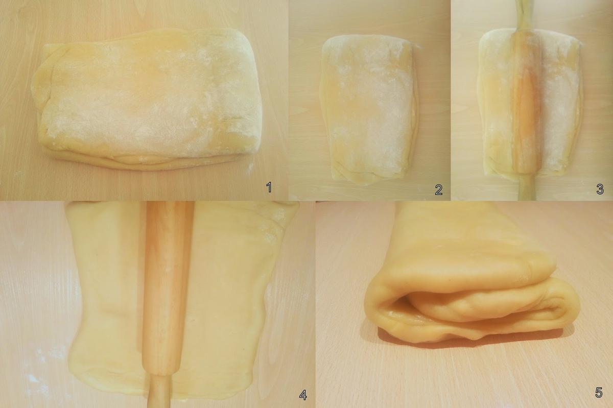 Pasado el tiempo sacamos la masa del frigorífico y la ponemos sobre la mesa de la misma forma como la teníamos antes de guardarla, osea, como si acabáramos de voltear los dos extremos sobre el centro (como el folleto), veremos a los extremos de arriba y abajo de la masa, los dobleces que hemos hecho, y a los lados, solo veremos una única linea de masa que se ha creado al doblar la masa. (Imagen B, foto 1)