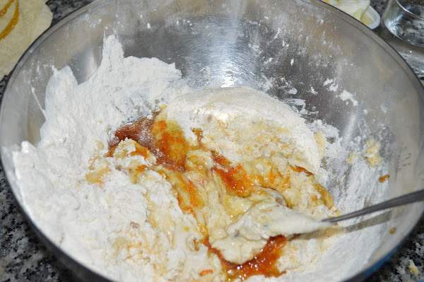 Añadimos el huevo batido en tres partes y amasando, la masa se te pegara un poco a la mano, es normal, quita la masa de las manos y espolvorea con un poco de la harina restante, así trabajar mejor la masa.