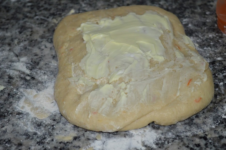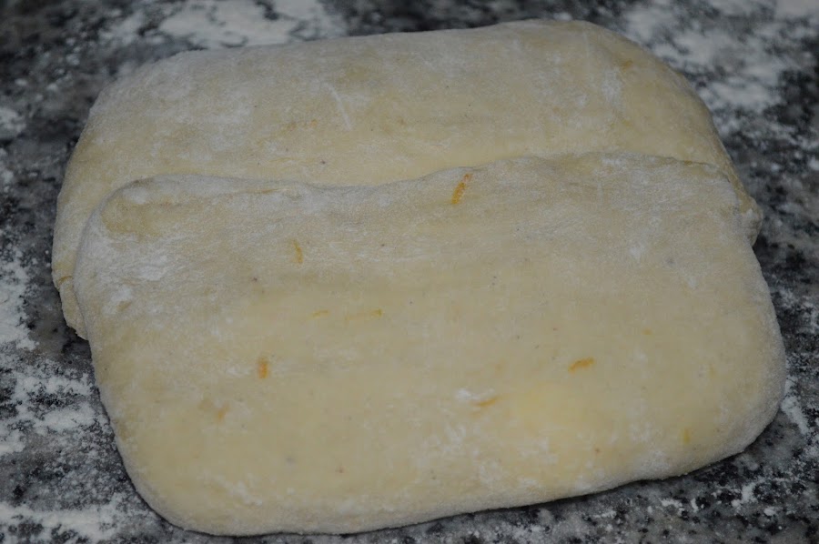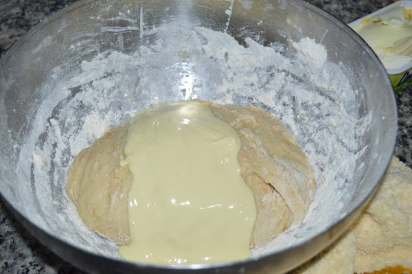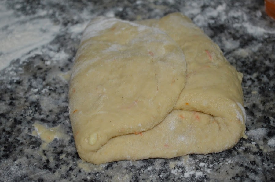 Volcamos sobre la mesa, espolvoreada con harina y hacemos un cuadrado agregamos 1/3 parte de la mantequilla pomada, hacemos dos dobles las centro, luego las esquinas, como una masa hojaldrada, y repetimos veces mas el procedimiento con la mantequilla restante,