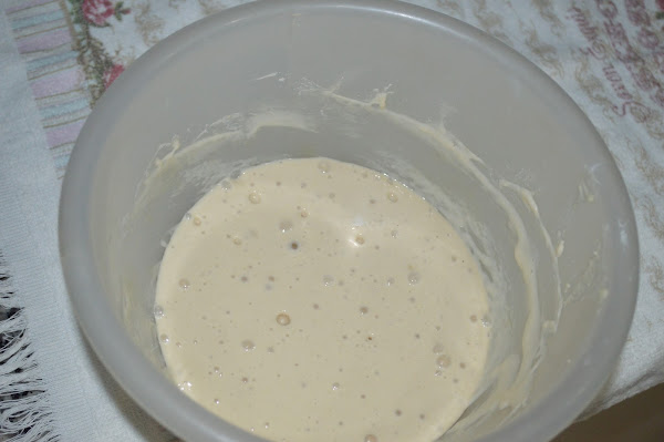Para la primera preparación, diluimos en el agua templada la miel y la levadura, luego añadimos la harina, mezclamos bien con un tenedor hasta obtener una pasta un poco elástica reservamos hasta que doble su volumen.
