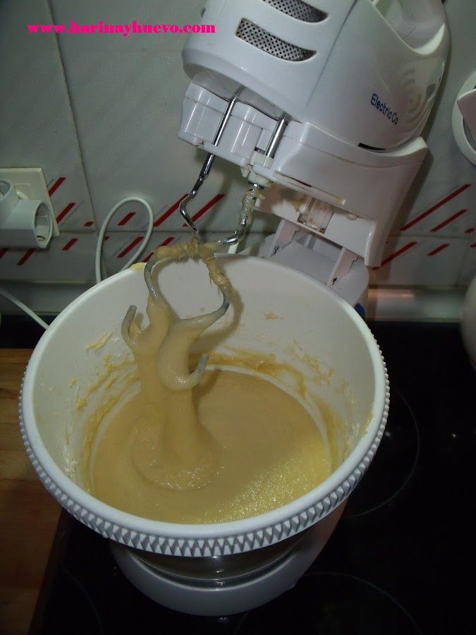 Metemos otra vez todos los ingredientes en la amasadora y amasamos durante 10-15minutos. Respecto al vídeo creo que me ha quedado más líquida, creo que es porque he usado huevos L, por eso os he puesto que uséis huevos M. En esta foto veis como es mi amasadora y como queda la masa. La masa se queda adherida a las varillas, no es tan consistente como la del pan. Está entre el pan y el bizcocho.
