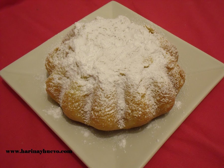 Se mete otros 20 minutos en el frigorífico. Después de esto se hace una bola eliminando los dobleces y se mete en el molde que se vaya a usar. El molde se untará con mantequilla y azúcar, sí az´car, antes de poner la masa. Hay un molde especial para el pandoro pero como no lo tengo lo he metido en una flanera, y como no me cabe lo he dividido en dos. El próximo que haga lo dejo en un solo molde redondo y ya os cuento si se nota la diferenia o no.