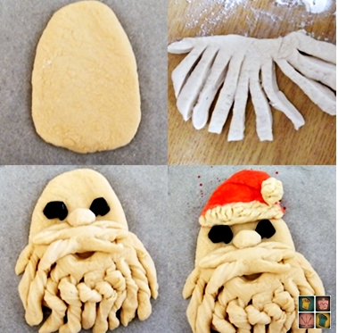 La receta es la misma que podéis ver entrando en este enlace de pan también para hacer con niños; Con 400 gr. de harina como indica la receta, salen 5 panecillos, seguir los mismos pasos hasta el punto 4, una vez reposada la masa, hacer porciones en 140 gr., a su vez dividirla en una porción para la cara, otra para la barba, el bigote, nariz y gorro, ir formando la cara según las fotos que os pongo a continuación, para "pegar" cada pieza, pincelar con un poco de agua.