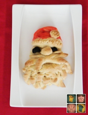 El color rojo del gorro se lo doy con una gota de colorante alimentario rojo disuelto en agua. Para los ojos dos medias aceitunas.