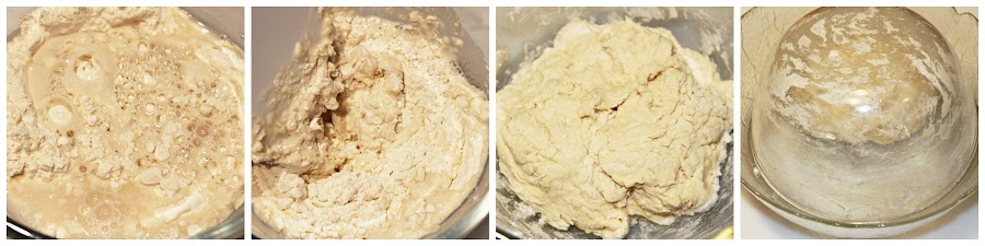 En otro bol más grande, añade la levadura y el agua templada. Mezcla con una cuchara de madera.Con ayuda de una cuchara de madera, mezcla los ingredientes húmedos junto con los secos. Ayúdate con las manos y liga bien la masa. Cubre con el bol pequeño.