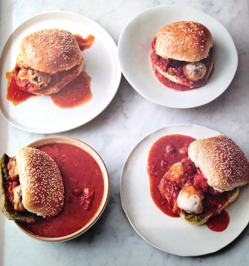 Cortamos los panecillos y extendemos 1 cucharadita colmada de pesto en el interior de cada uno. Rellenamos con las albóndigas con mozzarella y un poco de salsa y servirmos el resto de la salsa a una lado para mojar.