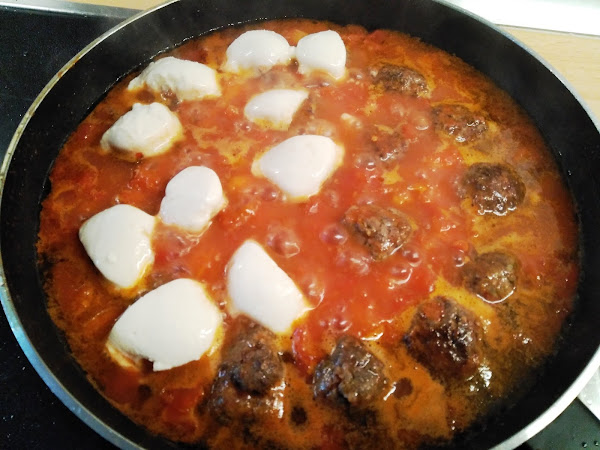 Cuando las albóndigas estén doradas vertemos los tomates en la sartén, aplastándolos con una cuchara de madera, junto con unos 100 ml de agua. Llevamos el tomate a ebullición, cortamos la mozzarella en rodajas y las ponemos encima de las albóndigas, tapamos la sartén y dejamos que la salsa se espese 5 minutos a fuego medio. Mientras, calentamos los panecillos en una sartén grande antiadherente sin aceite o en el horno a temperatura suave.