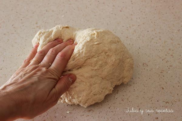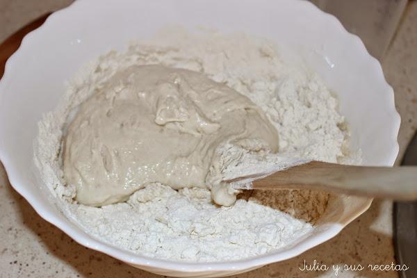 En un bol ponemos la harina, la sal, el resto de agua y el poolish, amasamos y ponemos la levadura al final del amasado y seguimos amasandola hasta que se integre bien.