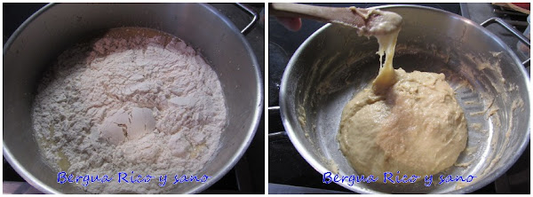 5. Incorporamos los primeros 200 g de harina y mezclamos muy bien para que todo quede incorporado sin dejar nada de harina cruda sin mezclar. La masa resultante será muy pegajosa en esta fase. Tapamos la cazuela y le damos 1 hora de levado para que se active la levadura y fermente.