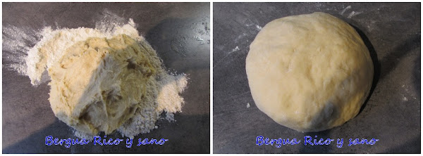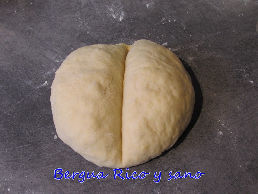 8. Formamos una bola con la masa, enharinamos la superficie con la harina que tenemos sobre la superficie de trabajo y cortamos en 6 porciones del mismo tamaño (2 mitades y tercios en cada mitad).