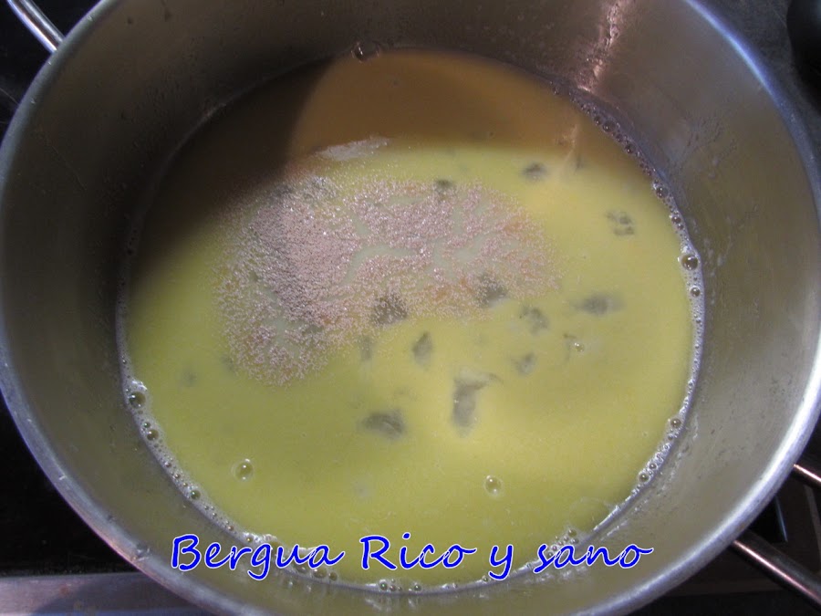 2. Apagamos el fuego y apartamos un poco la cazuela; añadimos el azúcar, la leche y la sal. Mezclamos bien hasta que todo se haya disuelto en la leche.