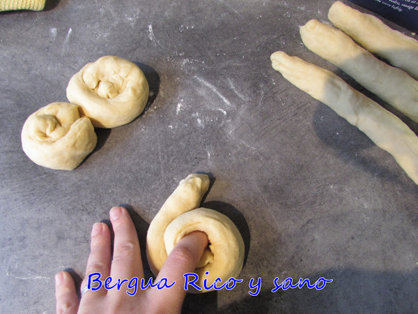 9. Ahora toca enrollarlas; básicamente hay que hacer una espiral, yo lo hago alrededor de mi dedo para conservar el agujero abierto, ya que uno de los extremos lo introduciremos por la base y lo sacaremos por arriba. Y si no, enrollado en espiral está perfecto también; realmente les puedes dar la forma que quieras. Eso sí, nos aseguramos de unir los extremos al resto de la masa al final para que no se abra la caracola al hornear. La masa en blanda y aún algo pegajosa, aunque mucho menos; es normal. Si te cuesta darles forma, mánchate las manos con un poco de polvo de harina.