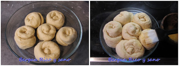 10. Colocamos las caracolas en una bandeja o un recipiente apto para horneado, da igual si es cuadrado, rectangular, redondo, ovalado... Si es un recipiente donde piensas que se puedan pegar, pon primero un trozo de papel de hornear sobre el fondo. Tienen que quedar cerca, pero con espacio para crecer, porque les vamos a dar 60 minutos de levado. A la media hora parecerá que ya han crecido lo suficiente, pero hazme caso, dales la hora entera para que los ingredientes de la masa hagan su trabajo.