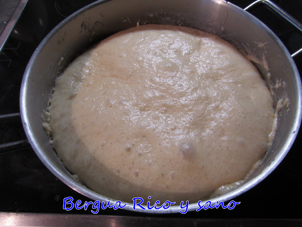 6. Pasado ese tiempo, la masa habrá doblado en volumen. La desgasificamos simplemente manejándola con las manos durante un par de minutos para sacar el aire y le damos 30 minutos más de levado, otra vez con la cazuela tapada.