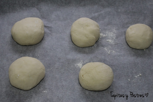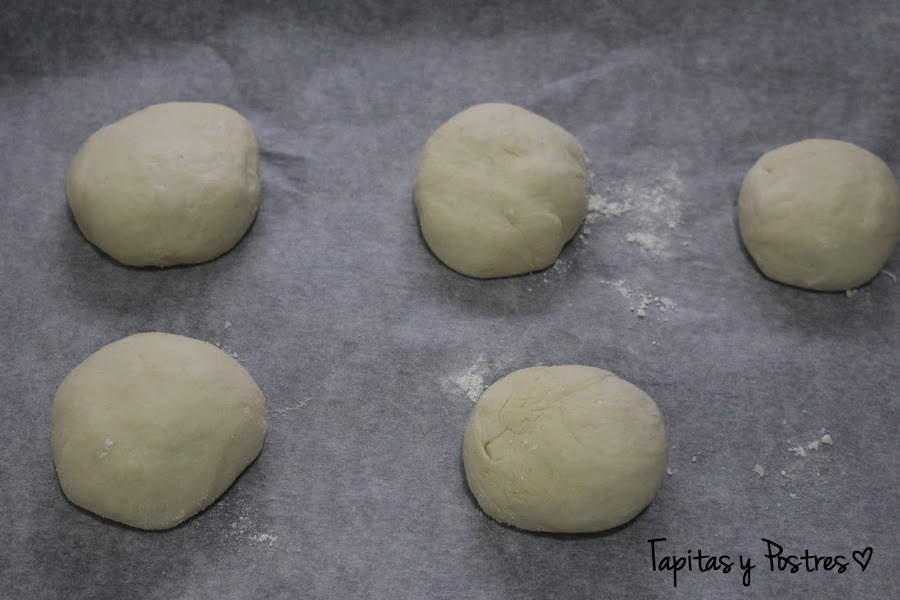 Sacamos y amasamos y hacemos porciones de unos 60 gr. Damos forma redonda y aplastamos un poco. Dejamos reposar otra media hora.