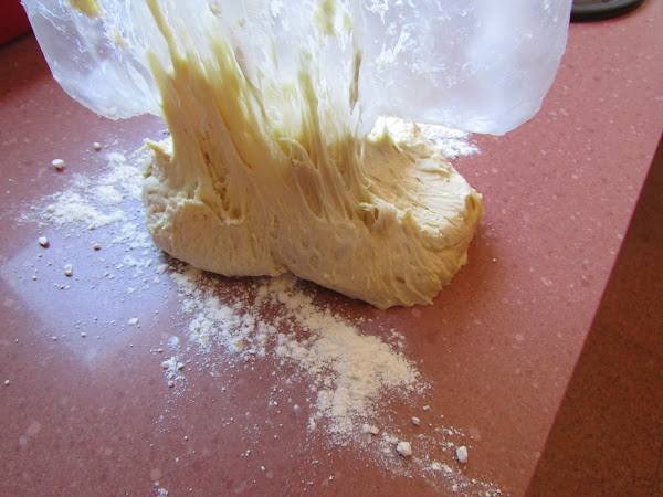Una vez transcurrido el tiempo de reposo, poner la masa sobre la superficie de trabajo espolvoreada de harina,