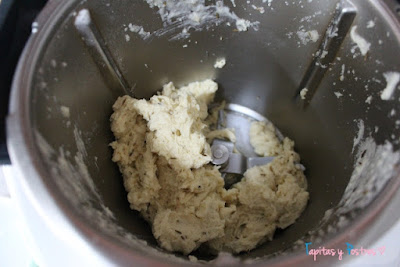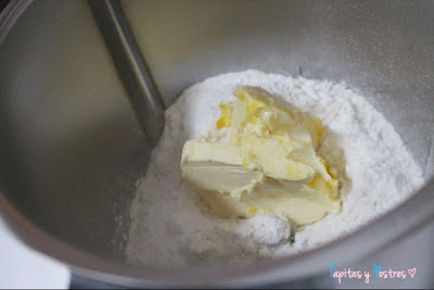 En el vaso de la thermomix o de una batidora ponemos la harina, sal, azúcar, levadura y mantequilla. Mezclamos 10 segundos a velocidad 5.