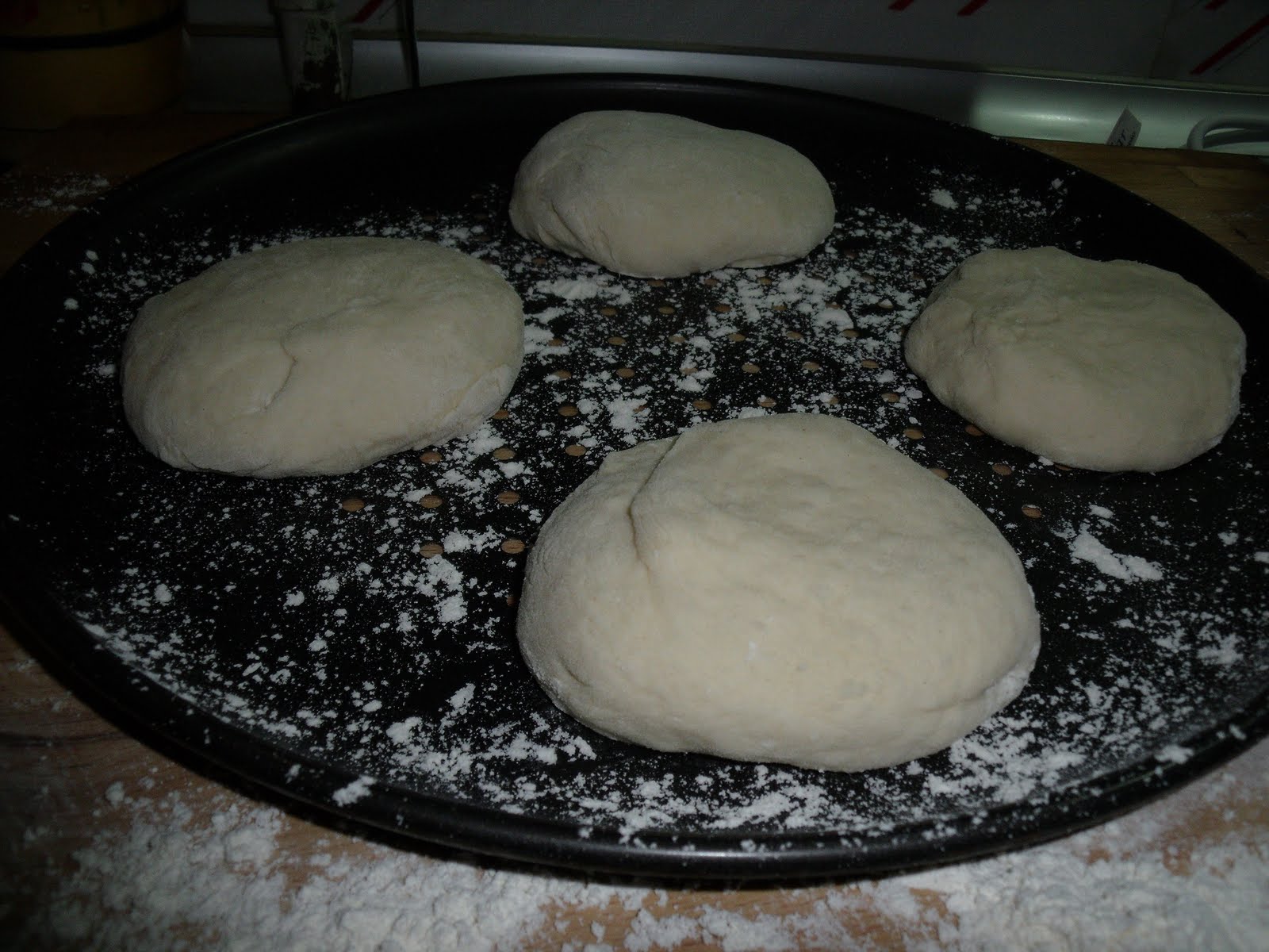 Estos bollitos lo ponemos en la bandeja del horno, poner un poco de harina también en ella, y los dejamos reposar. Si vamos a usarlos para hamburguesa es mejor que queden consistentes y por tanto no los dejaremos reposar mucho, unos 20-30 minutos. Si por el contrario lo queremos como pan "normal" dejamos reposar unos 50-60 minutos. Yo los he dejado una hora y en la foto podéis ver como han crecido.