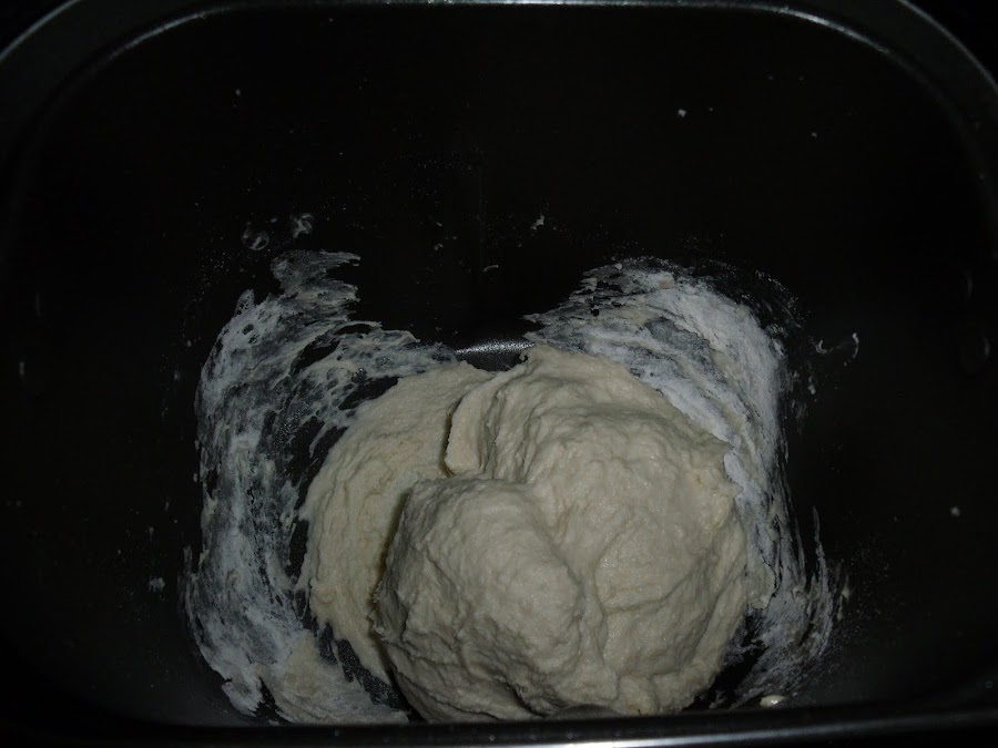 Metemos todos los ingredientes en la panificadora. Primero los líquidos templados, luego el resto y por último la levadura desmenuzada. Seleccionamos el programa de preparar masa. Como ya os he dicho alguna vez yo tengo la Clatronic BBA 3364 y el programa es el 8.