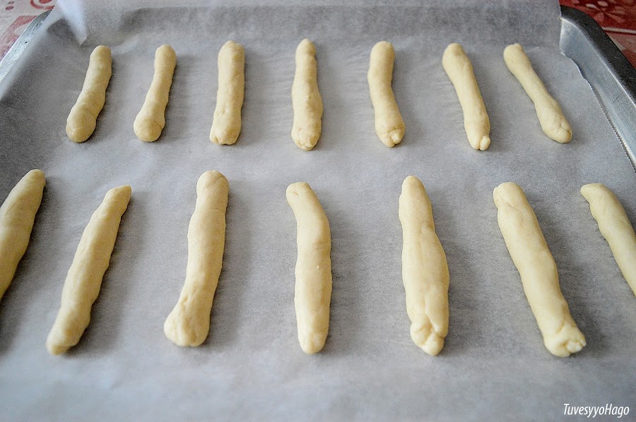 4. Saca la masa del vaso, y dale a la masa forma de churrito alargado u otra que quieras que quieras, y pinta la superficie con leche. Déjala reposar hasta que doble su volumen.