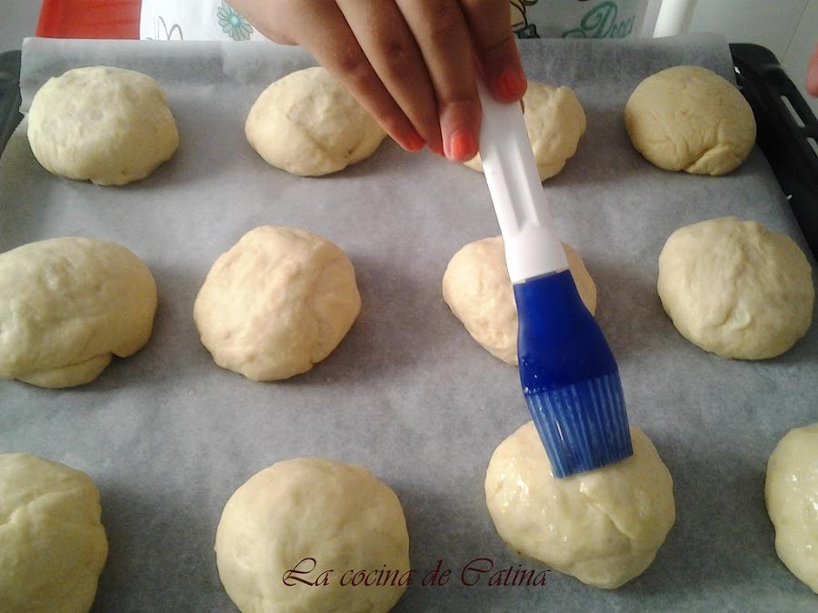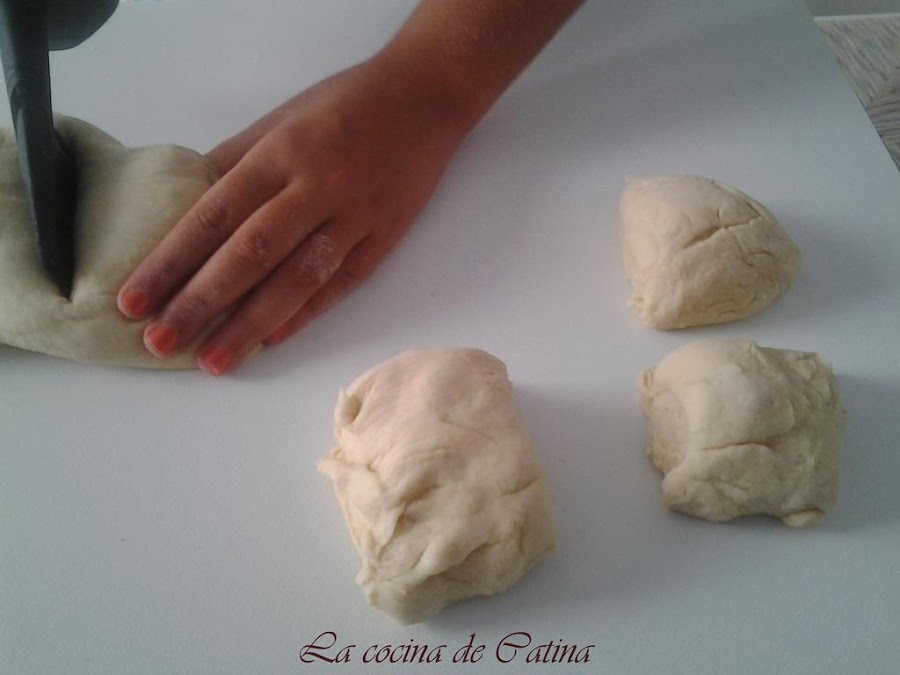 Pasamos la masa a la mesa de trabajo y movemos con las manos para desgasificar. Dividimos la masa en porciones del tamaño deseado, (yo las hice de 70 gr aproximadamente) y hacemos pequeños bollos.