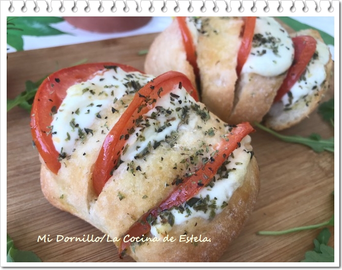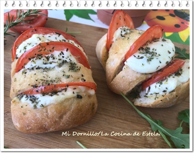 Con la ayuda de una cucharita vamos poniendo un poco del aceite, sal y hiervas que hemos preparado, en cada raja que le hemos hecho al pan, y después ponemos una rodaja de tomate con otra de mozzarela, en cada raja del pan.