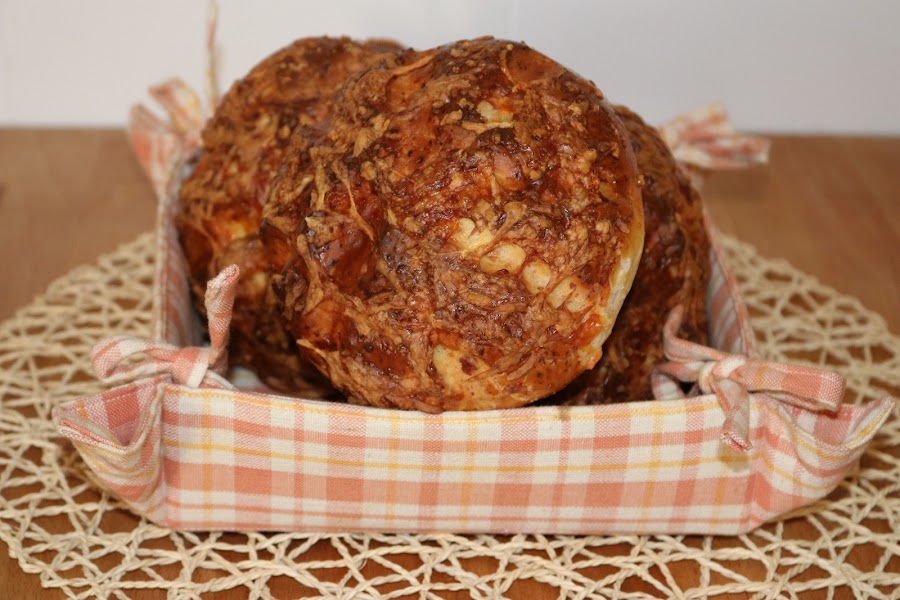Darle forma redondeada y aplastar un poquito, darle unos cortes arriba y pintarlos con huevo batido( para que se adhiera mas el queso), aunque los podéis pintar con agua.