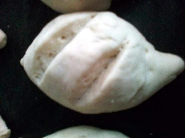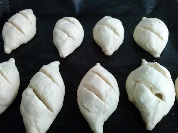 Saca la masa del vaso y haz bolitas de unos 40 g. más o menos y da la forma a los bollitos moldeando unas puntas en los extremos . Haz unos cortes con un cuchillo afilado , ponlos en una bandeja de horno forrada con papel de hornear y espera a que doblen su volumen en un sitio apartado de corrientes ( puedes meterlos en el horno sin temperatura ).