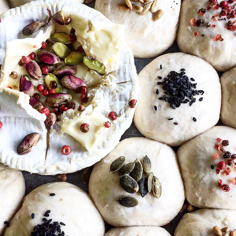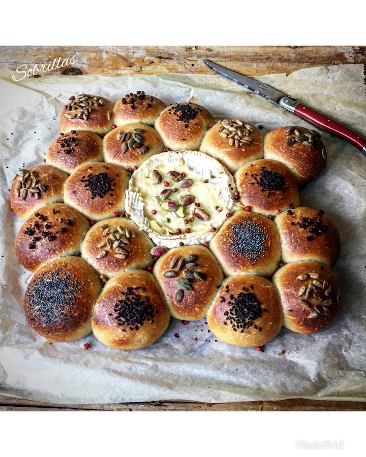 Mi propuesta son unos panecillos de yogurt y miel acompañados de un Camembert tuneado con pistachos y pimienta rosa. Espero que os guste.