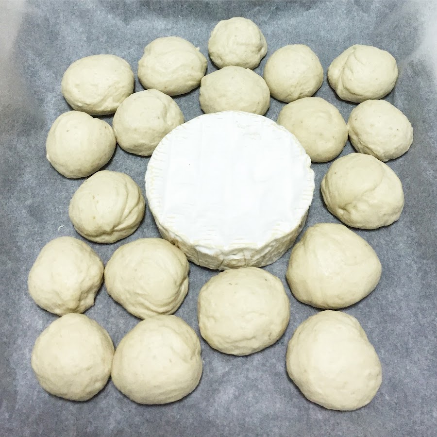 Cogemos de la masa porciones del tamaño de una bola de golf, boleamos y vamos poniendo alrededor del queso dejando espacios entre panecillo y panecillo.