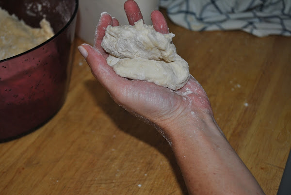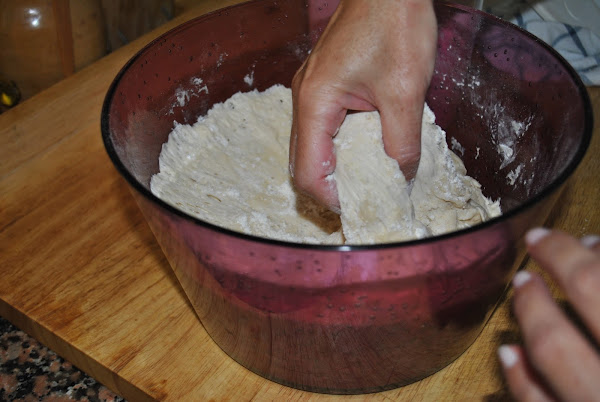 Es importante dejar la otra limpia para ir dándole vueltas al bol donde estamos preparando nuestra masa. Èsta debe quedar pegajosa, si no lo está debes añadir más agua (siempre tibia).