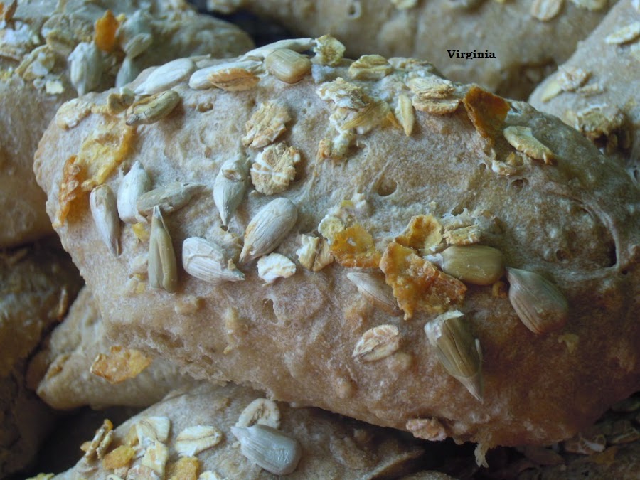 5.- Pulverriza los panecillos con agua y rebozalos en el muesli reservado. Colocalos en una bandeja de horno forrada con papel de hornear. Con un cuter o cuchillo afilado haces unos cortes a lo largo y los dejas reposar cubiertos con un paño durante hora y media.