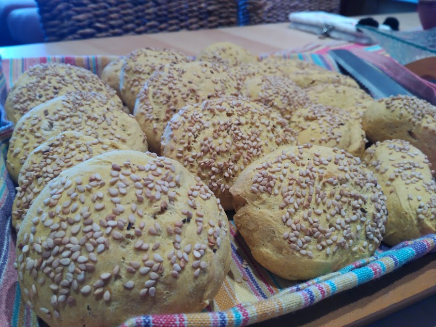 - Les damos la forma que queramos y pasamos la parte superior de cada bollo por un plato con sésamo, que se enganche bien. Los vamos colocando en una bandeja de horno.