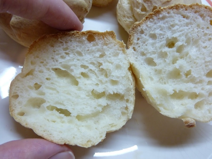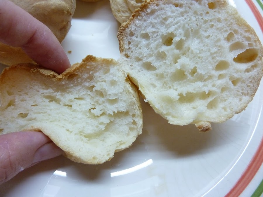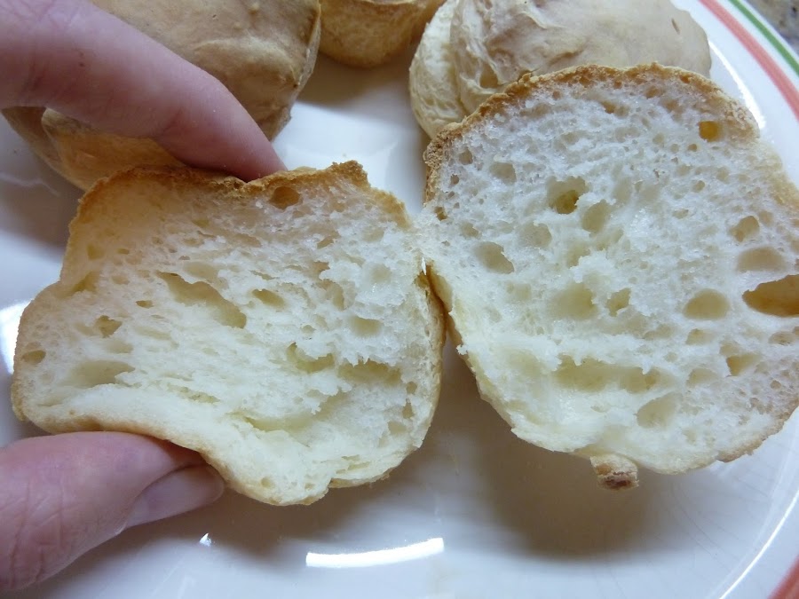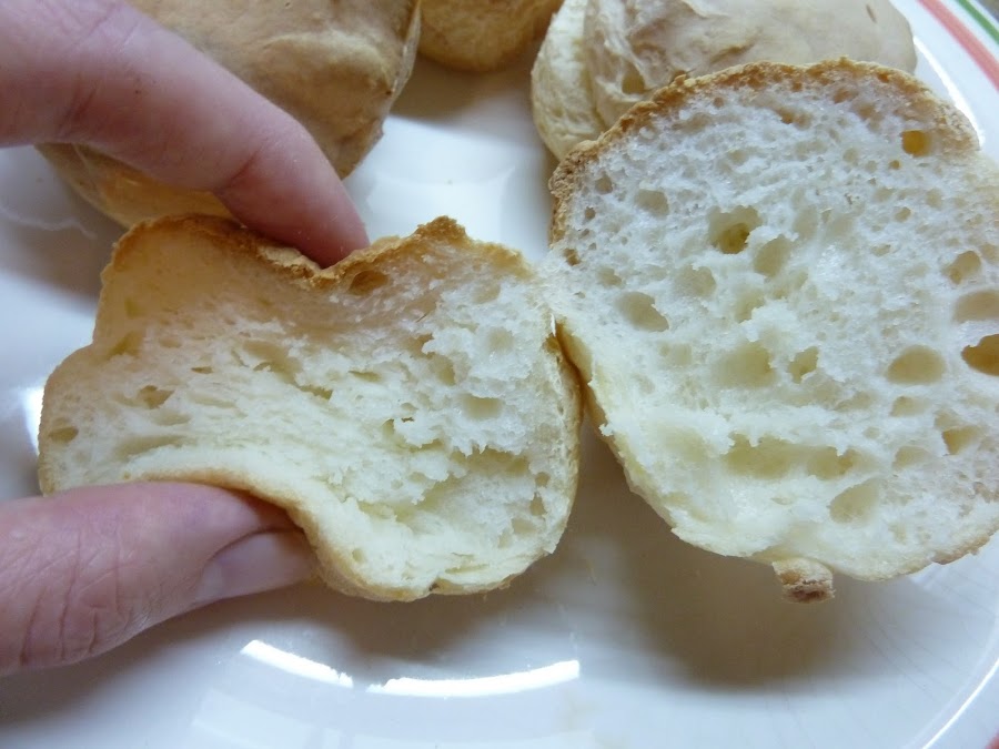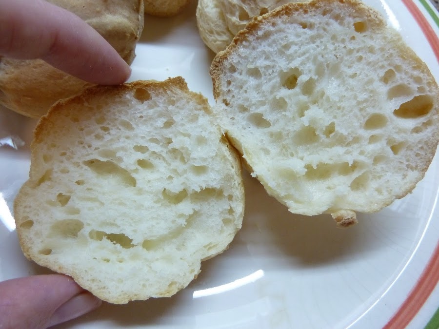 Recién horneado resulta un pan de corteza fina, apenas crujiente, tierno y esponjoso por dentro...y de sabor muy glutenero, que al final es lo que más perseguimos. Nada que envidiar al sabor de los panes hechos con la harina Schar, que son los que más me han gustado hasta el momento. Me he llegado a plantear qué pan de estos dos me gusta más y después de darle muchas vueltas no me decido, porque son panes distintos: el de "la masa" es más pan pan, y estos panecillos son más tipo bollitos o pan de leche. Si los hacemos de un día para otro, guardándolos dentro de un táper o bolsa de plástico, la corteza se reblandece, pero sigue igual de tierno y esponjoso, y de sabor buenísimo. De hecho lo primero que han dicho mis dos críticos culinarios más estrictos (mi madre y mi marido) es que no sabían a "sin gluten". Sólo queda que los probéis y decidáis vosotros mismos.