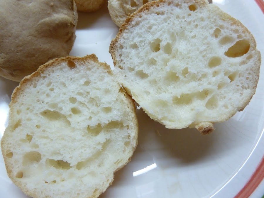 La alternativa ha sido probar a adaptar otro pan que me gusta muchísimo, el "pan miguel", en formato panecillo, para lo que he tenido que cambiar un poco la proporción de harinas, ya que con la receta original sale un pan demasiado alveolado para panecillo. La cuestión es que quiero hornearlos la misma mañana del cumple, para que estén recién hechos, pero la masa tengo hacerla con antelación y congelarla ya en porciones, para ese día (descongelando la noche anterior) tener solamente que hornear.