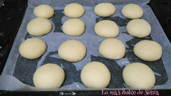 Cortamos la masa en porciones de 45-50 gr aproximadamente. Les damos forma de bola, aplastamos un poco y dejamos levar otra vez. Deben duplicar el volumen.