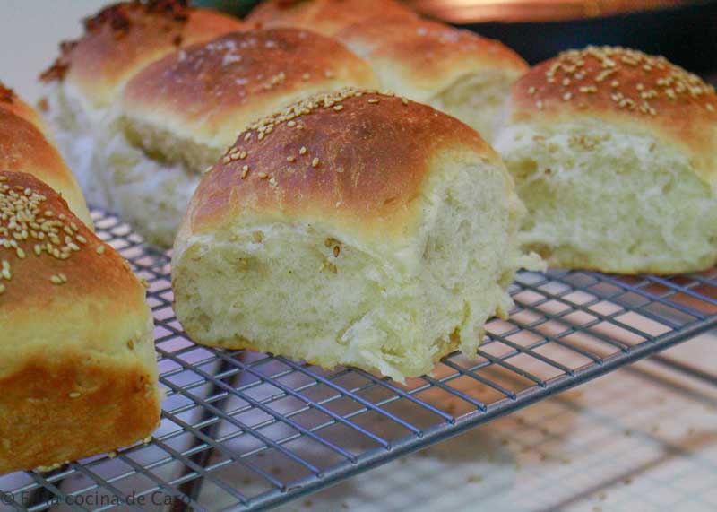 Precalentamos el horno a 190º. Pincelamos los panecillos con mantequilla derretida y podemos espolvorear por encima, copos de cebolla, semillas de sésamo, sal marina, en general lo que nos guste