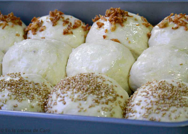 Preparamos un cuenco engrasado, ponemos la masa allí, tapamos con film y dejamos hasta que doble su volumen, como una hora. Engrasamos una fuente rectangular de 33*23. Cuando nuestra masa esté lista, la dividimos en dos partes y estas en 6, de esta forma tendremos 12 panecillos. Los colocamos en la fuente y tapamos con film y dejamos crecer por 30 minutos.